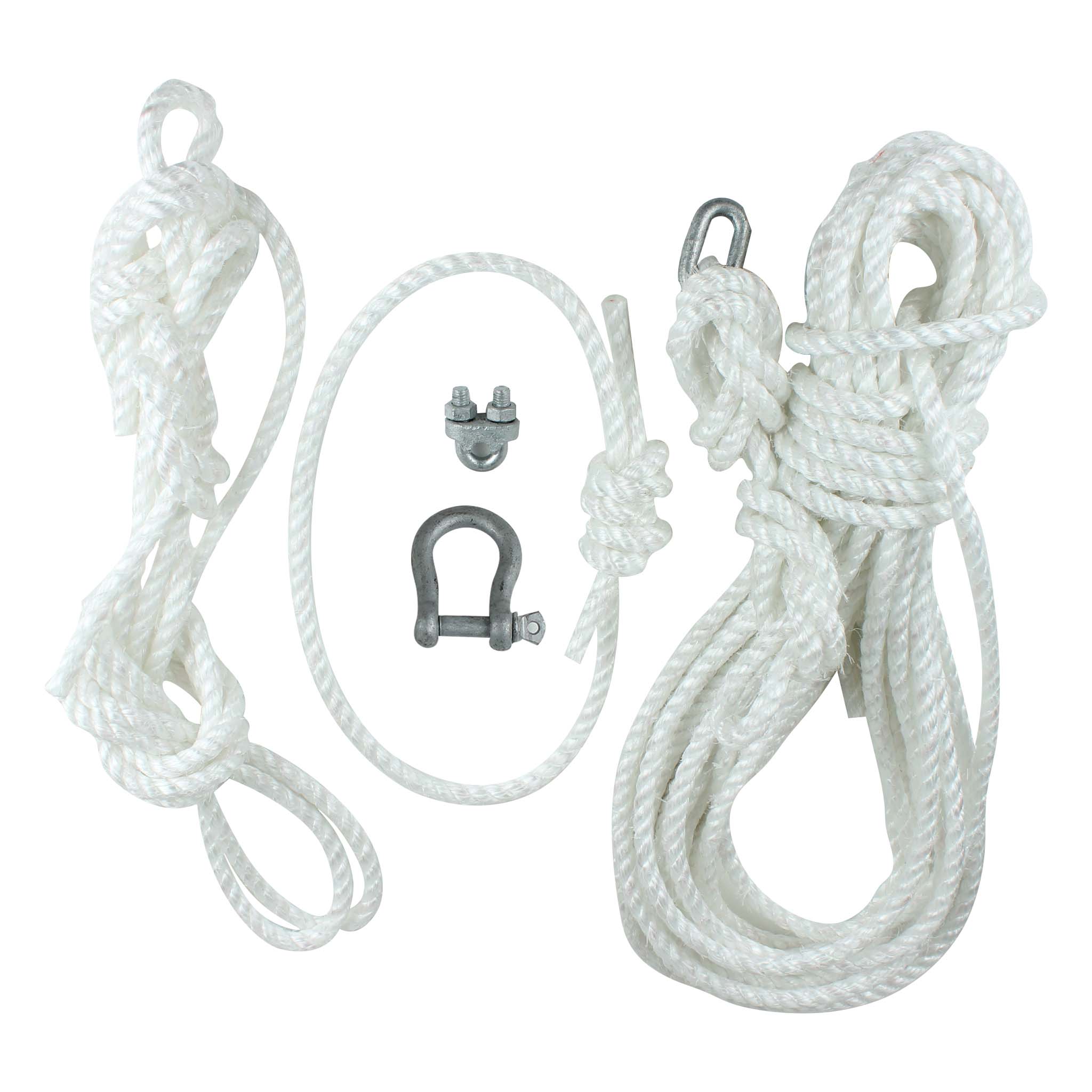 Lengths. All of the kits contain one long wire rope (the zip wire), and two shorter wire rope anchor strops (these wrap around you trees).