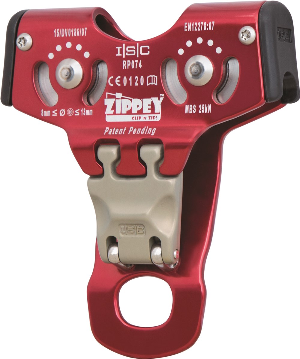 Zippey is manufactured from high-spec 4mm aluminium plate, has a forged Aluminium gate and Stainless Steel wheels; all of which offer the best weight to performance ratio on the market. The Zippey trolley weighs 450g (1.0lb), [equaling the weight of the Petzl Trac+], yet has an MBS of 25kN (5620lbf) and therefore exceeds the 2260kg (5000lb) rating required by US standards, as well as being fully CE approved.
